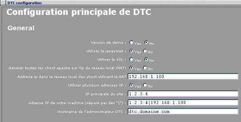 - Use SSL : If this option is activated, the access to the DTC panel (admin and client (on this example dtc.domaine.com)) will occur using https instead of http. DTC will use OpenSSL keys generated by default in /etc/apache/ssl. Issue the following commands to generate those cert files: