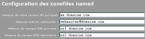 This part of the configuration tells how the name zone files will be generated. The following example zonefile corresponds to the snapshot. Values between [] are the one that can be configured using this HTML form. Those are default values, that can be overridden by subdomain, NS or MX configuration for each domains.